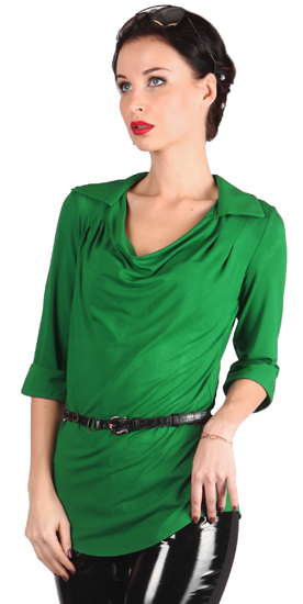 Удлинённая трикотажная блуза в стиле 80-х. Рубашечный воротник переходит в вырез – качели. Складки от плеча создают водопад драпировок. Спинка со складкой по центру - на кокетке. Рукав ¾ с манжетой/ отворотом. Линия низа закруглена. Силуэт прямой.