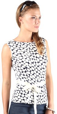 Лаконичный топ в геометричный овал- горошек с атласным пояском-лентой кремового цвета. Вырез-лодка. Прилегающий силуэт.