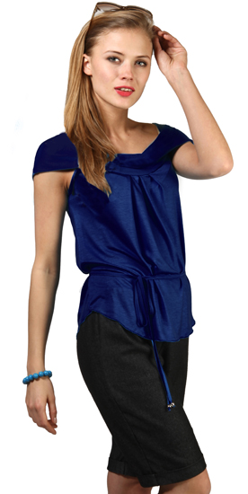 ДЕКОЛЬТЕ В ЦЕНТРЕ ВНИМАНИЯ! Оригинальная округлая кокетка- воротник прикрывает плечо и ниспадает отворотом. Декольте спинки регулируется завязками. Складки от кокетки спереди и сзади создают свободную летящую форму. Линия низа закруглена. В комплекте тонкий поясок с серебристыми наконечниками.