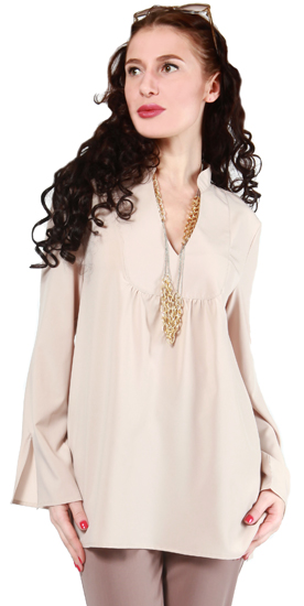 Хиппи-туника А-силуэта с мини воротничком-стойкой. Свободные рукава с разрезом внизу. Можно носить свободно и под пояс. Модно этим летом с узкими брючками. Длина 75см. Тонкий эластичный креп 95% полиамида, 5% эластана. Маш стирка 40 град. ПРЕВОСХОДНОЕ КАЧЕСТВО! На фото с брючками ГЛИТЕРАТИ цвета капучино 022-460 N.