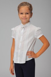 Нарядная белая блузка с коротким рукавом из сорочечной ткани для девочки старшего и младшего школьного возраста. Спереди изделие отделано группами мелких отстроченных складок, рукава и воротник украшены изящным кружевом. Удачно подобранный состав ткани — 65% хлопка и 35% полиэфира — является оптимальным сочетанием натурального и искусственного волокон, что обеспечивает комфортную носку изделия и минимальные требования к уходу за ним. Слегка приталенный силуэт, фигурная линия низа, небольшой рукавчик-фонарик придают классической модели современный вид, удовлетворяющий самые строгие требования и педагогического коллектива, и родителей, и детей. Блузка рекомендована как нарядное изделие, но может использоваться и для повседневной носки.
