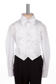Классический мужской жилет из роскошной жаккардовой ткани для мальчиков дошкольного возраста дополнен модным и стильным галстуком-бабочкой из того же материала. Такой элегантный комплект просто необходим юному джентльмену в торжественной праздничной обстановке.